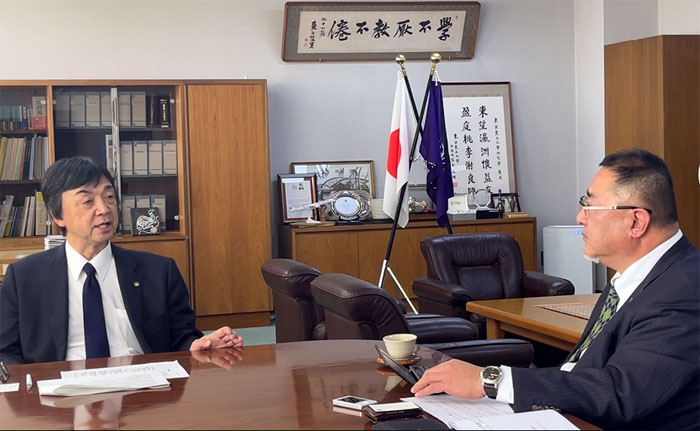 インタビューの様子(㊧千葉一裕学長と弊社社長山口貢)