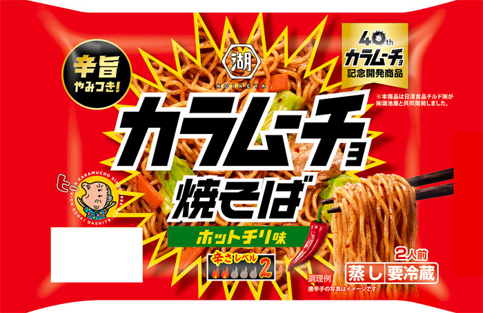 「カラムーチョ焼そば 2人前」は発売40周年を迎えた湖池屋の辛旨なスナック菓子「カラムーチョ」を焼そばにアレンジ。同品は「激辛ブームの火付け役」とも言われる存在だが、近年も販売は好調で、幅広い世代で認知率は90%に達するという。新商品はやみつきになるスパイシーな味わいで気分をリフレッシュしたい時の食事やお酒のおつまみにもぴったり。