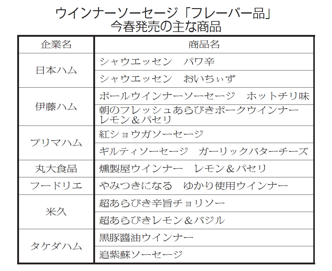 このように、ウインナーのフレーバー品はこれまでも各社が展開していたが、伊藤ハムのポールウインナーソーセージは今春、発売91年目で初のフレーバー品「ホットチリ味」を出すなど、各社強化を図る。