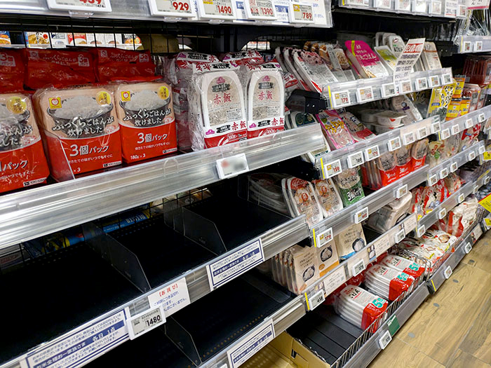 品薄のコメ売場にパックごはんを並べるスーパーも(昨年8月都内で)