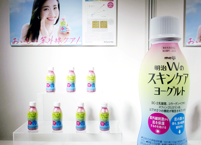 明治によれば、女性健常人67人を対象とした試験において、SC-2乳酸菌、コラーゲンペプチド、スフィンゴミエリンを含むヨーグルトを1日1回6週間摂取したグループは、3成分を含まない酸性化乳を摂取したグループに比べMED(日焼けが始まる最少紅斑紫外線量)の数値が高まった。