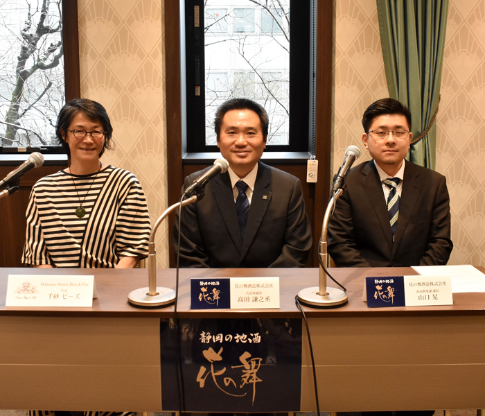 両社のタッグはシモン・ビーズ社の当主である千砂・ビーズ氏の父親が浜松市出身だった縁で実現した。花の舞酒造の高田謙之丞社長は「当社は以前からワイン酵母で仕込む日本酒『Abysse(アビス)』を販売してきたが、使用する酵母のワイナリーを明確にして商品開発したのは新たな試み」と説明。「アルコール度数は一般的な日本酒に比べて低く、ワイン並みの12%に抑え、食事とあわせてゆっくり楽しんでいただけることを目指した。世界中で親しまれるワインの魅力を日本酒に取り入れ、新たな価値を訴求していきたい」とアピールした。