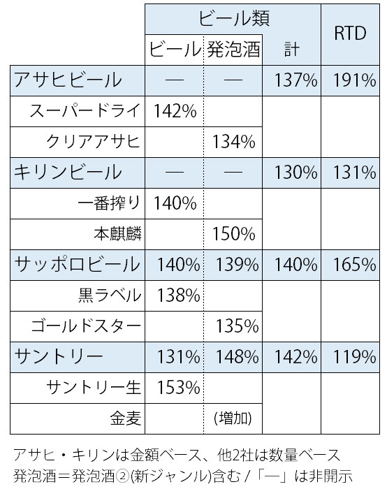 また缶チューハイをはじめとしたRTDはメーカー間のばらつきが大きいものの、やはり軒並み大きく伸びた。
