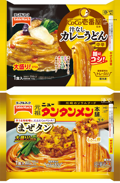 ホーム 冷凍うどんで新提案 テーブルマーク 夏場の麺市場を活性化 「CoCo壱番屋監修 汁なしカレーうどん 大盛り」/「元祖ニュータンタンメン本舗監修 まぜタン 大盛り」