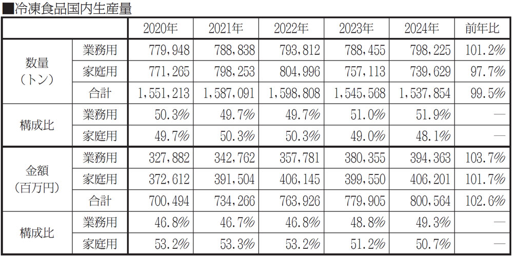 4月17日に開いた記者会見の席上、出倉功一専務理事は「家庭用のマイナスはコメや野菜の価格高騰で支出が抑えられた影響が大きいとみている。冷凍食品は価格改定を実施しながらも引き続き需要は根強いとの印象。業務用はインバウンド消費の広がりに加え、人手不足を背景に外食・惣菜・給食の各業態でニーズが高まっている」との見方を示した。