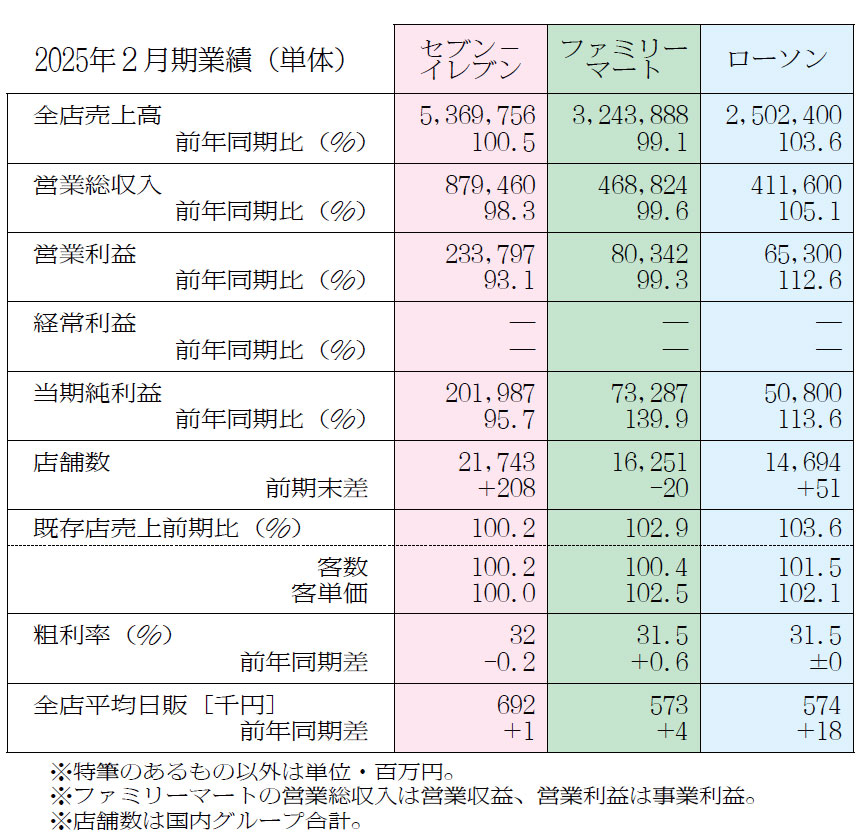 コンビニ大手3社の25年2月期業績(単体)が出そろった。各社ともに既存店売上高、全店平均日販、客数・客単価が前年を上回り、物価高騰のなか来店につなげるための価格戦略や、話題性あるキャンペーン施策が奏功した。夏の猛暑やインバウンド需要も追い風となった。
