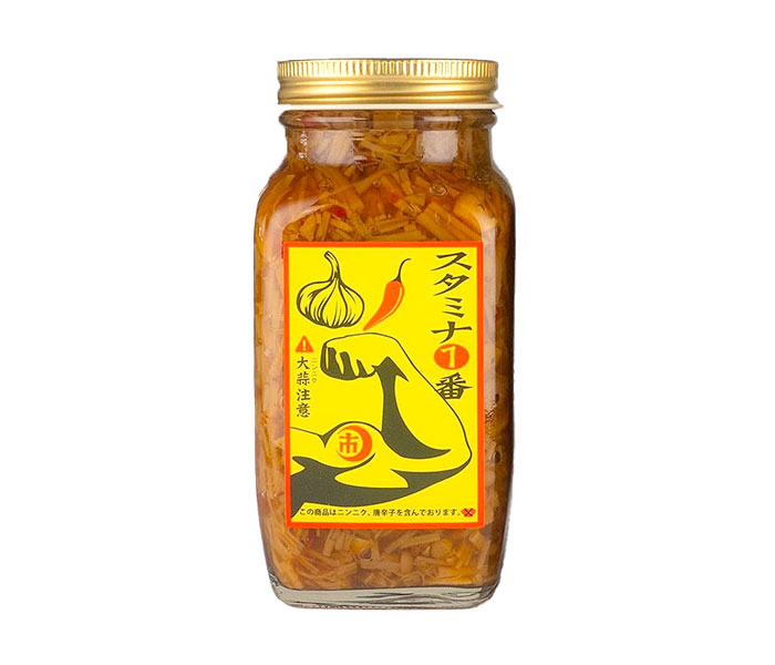 にんにくと唐辛子のパンチが効いたなめ茸商品。もともと自衛隊のスタミナ飯として長年愛されていたが、2016年に発売した市販用400g角瓶がヒット。ご飯のお供としてだけでなく、調味料としても幅広く使える。