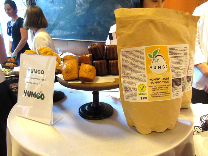 フランスや日本でパン・菓子店を運営するメゾンランドゥメンヌはプラントベース(PB)の卵代替素材「YUMGO(ユンゴ)」を紹介。アレルゲンフリーやカーボンフリーの観点から注目されており欧州、日本、台湾などに展開。会場では「ユンゴ・パウダー」を使ったメロンパンやフィナンシェを提供した。