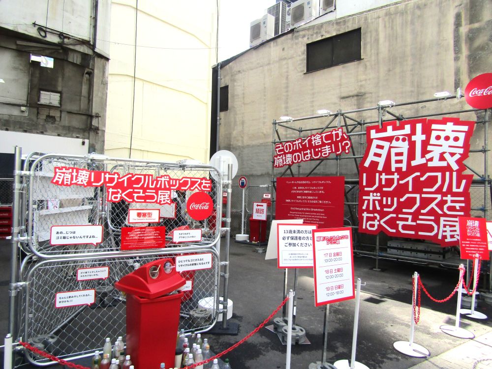 10月17日から19日までの3日間、渋谷道玄坂広場(東京都渋谷区)で「崩壊リサイクルボックスをなくそう展」と題したイベントを開催して、カップを入れるといった何気ない行為がリサイクルを著しく阻害しうることの気づきを与え、やんわりと“やめて!”と呼びかける。