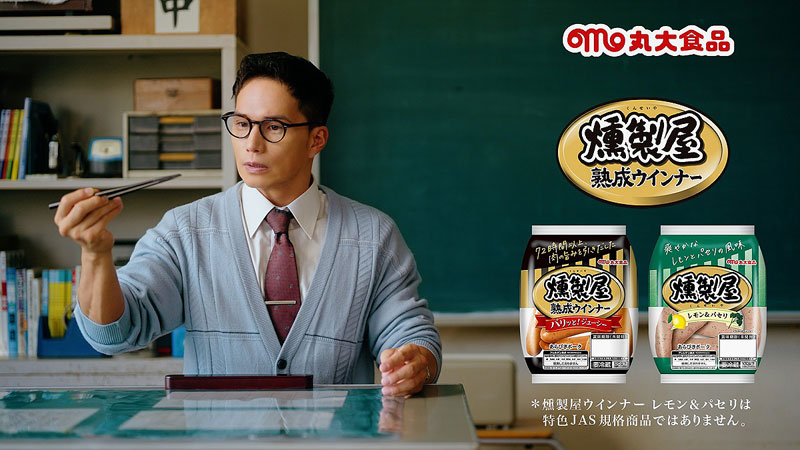 CMの熟成篇ストーリーでは、給食マニア教師が給食のメニューについて考えすぎて妄想の世界に入ってしまい、そこに「燻製屋熟成ウインナー」が現れ、72時間以上の熟成で肉の旨みを引き出した熟成ウインナーが調理されていく過程を臨場感溢れる様子で描かれる。