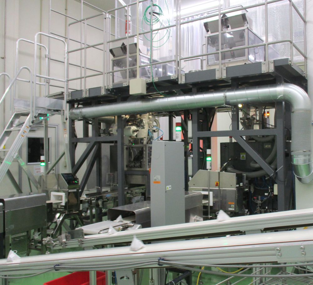 充填エリアは正確には2階構造となっている。上階の茶葉用のタンクとパウダー用のタンクから、パイプを通じて原料を下層の充填機に投下。原料が充填された三角ティーバッグが4個ずつ袋詰めされ、1ケース6袋入りの荷姿で出荷している。