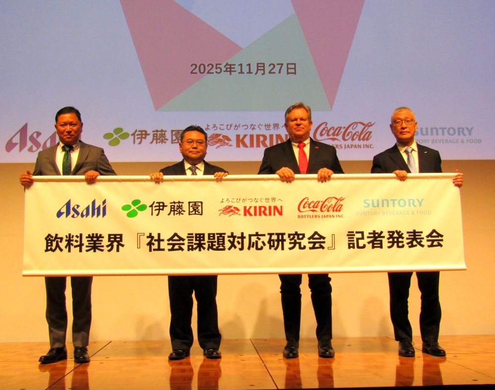 なお11月27日の発表会には、伊藤園の永田幸三執行役員生産本部副本部長、キリンビバレッジの坂口典優常務執行役員生産本部長、コカ・コーラボトラーズジャパンのアンドリュー・フェレット執行役員最高SCM責任者兼最高サステナビリティ責任者兼SCM本部長、サントリー食品インターナショナルの風間茂明常務執行役員SBFジャパン生産・SCM本部長が登壇した。