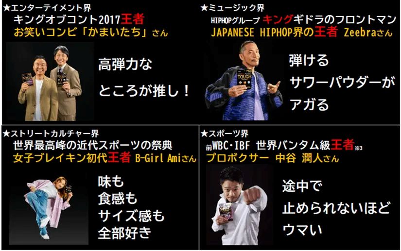 選定にあたっては「できるだけ業界が偏らないように『タフグミ』好きな有名人を選ばせていただいた。各界のファンの方たちとの新たな接点獲得を見込んでいる」と説明する。