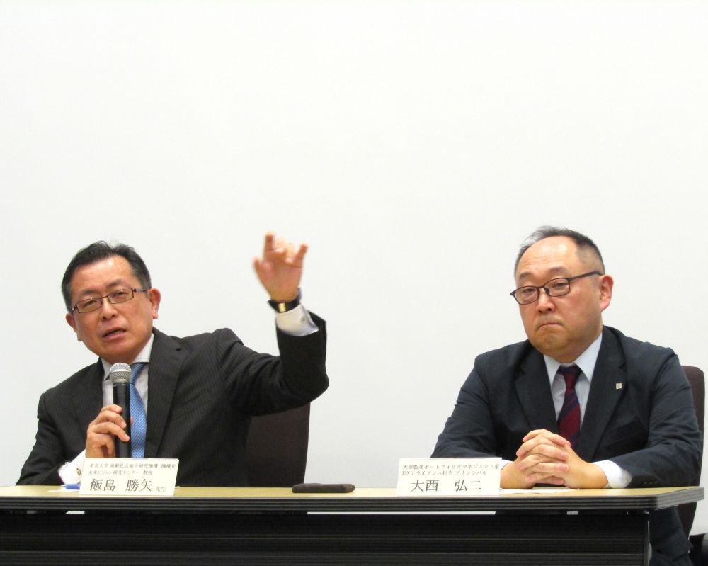 左から東京大学高齢社会総合研究機構機構長の飯島勝矢氏と大塚製薬ポートフォリオマネジメント室DXアライアンス担当プリンシパルの大西弘二氏