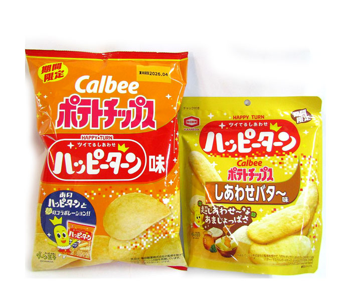 カルビーが「ハッピーターン」の味わいを再現した「ポテトチップス ハッピーターン味」(65g)、亀田製菓がカルビーの「ポテトチップス しあわせバタ~」の味を再現した「ハッピーターン しあわせバタ~味」(35g・71g)をそれぞれ発売した。