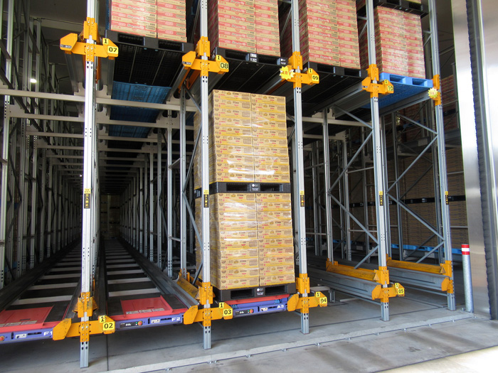 積載効率を高めるため、ケースを積む段数を上げる工夫なども随時検討中。ラップ自動巻き機を使って荷崩れ防止や運びやすさにも配慮する。