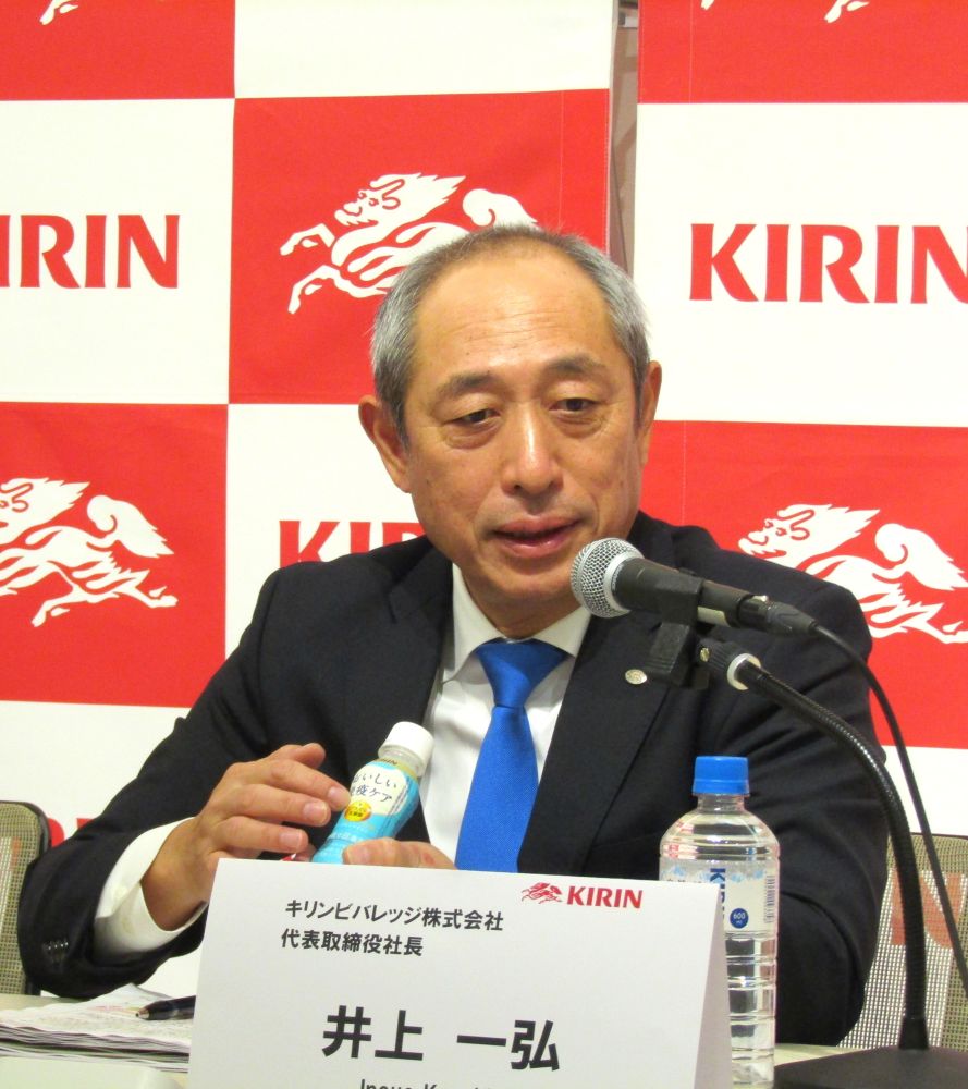 12月18日、年末会見に臨んだ井上一弘社長は「『プラズマ乳酸菌』入り飲料が大きく成長した。ヘルスサイエンス飲料を柱にしていくという意識が全従業員にやっと根付き『おいしい免疫ケア』については流通企業さまの導入率も上がっていきている」と振り返る。