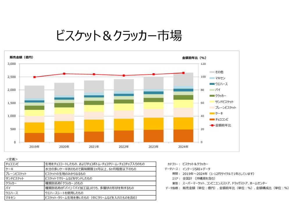 24年のチョココンビ販売金額は19年比36.5%増、前年比2.2%増の490億円。ビスケット&クラッカー販売金額は近年右肩上がりで成長し24年は前年比6.1%増の2662億円、今年1-10月には9.6%増の2374億円を記録した。1-10月のカテゴリ別では、チョココンビ(11.8%増)、サンドビスケット(14%増)、パイ(12.5%増)、ビスケット・クリーム生地を巻いたマキセン(29%)が牽引役となった。