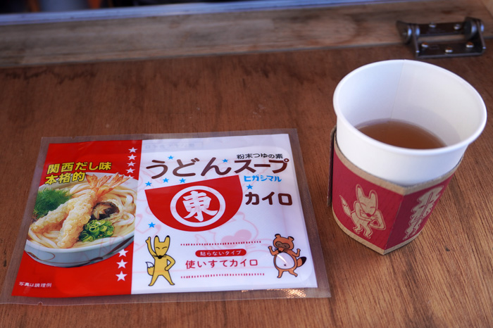 さらに会場6階の「おもはらの森」では、1月10日~12日と1月17日~18日の計5日間、1日4回にわけて「うどんスープ試飲およびカイロ配布イベント」を実施。温かい「うどんスープ」をオリジナルカイロをつけてプレゼント。寒さも手伝い初日の10日にはオープン前から長蛇の列ができ、1日1,000杯のうどんスープは数十分で配り終えた。会場の屋上テラスには椅子とテーブルが配置され、家族連れやカップルなどで賑わい、スープカップに印刷されたキャラクターをスマホで撮影する女性ファンもあった。