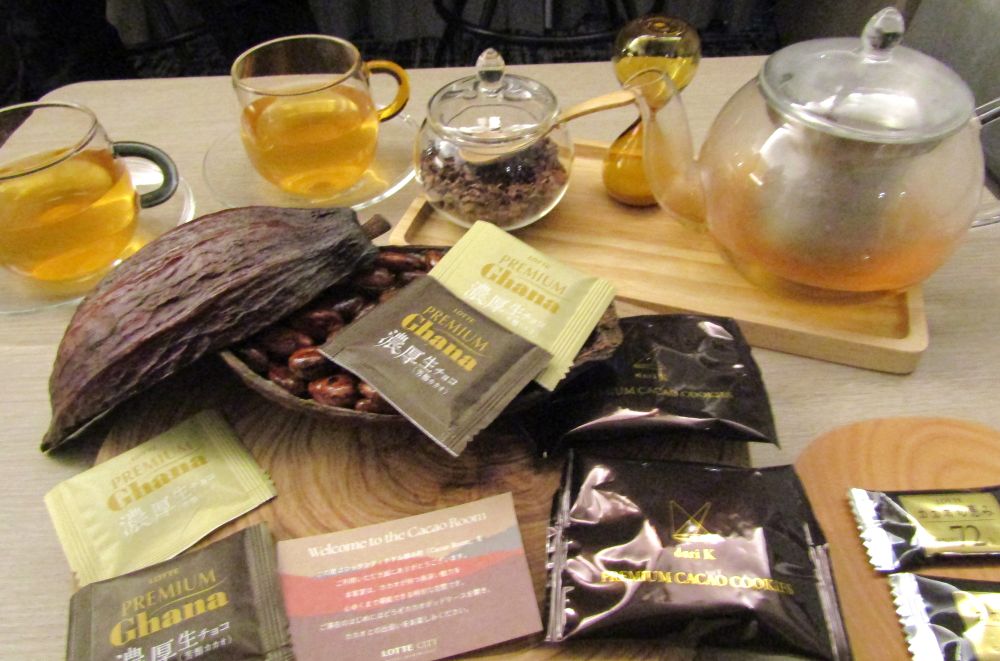 「Cacao Room」では、チェックイン後の「ウェルカムカカオスイーツ」として「カカオポッドケース」に詰め合わされたロッテグループのチョコレートや、カカオニブを使用した「カカオティー」などが楽しめるようになっている。