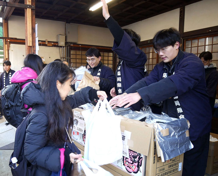 大阪海苔協同組合は節分の日の3日、大阪市の大阪天満宮で海苔チャリティセールを開催。焼海苔と寿司海苔(各2袋・20枚)、味付海苔の福袋(2個入)をそれぞれ1000円、プレミアム焼海苔(3袋30枚)を2000円の買い得価格で販売した。