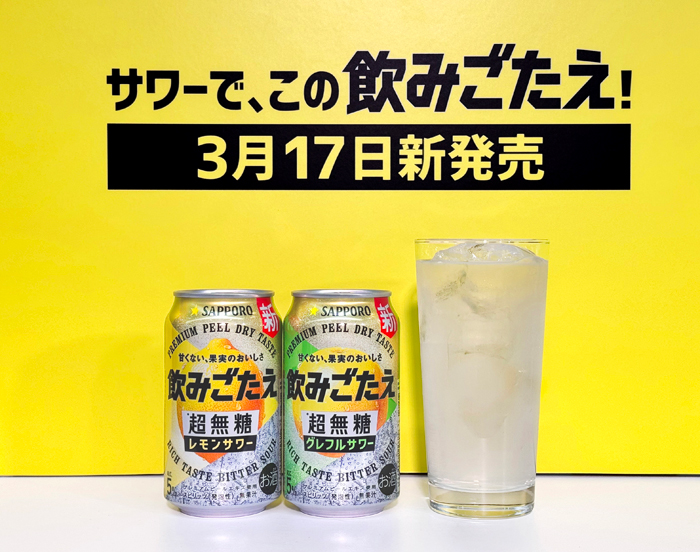「サッポロ 飲みごたえ〈超無糖〉」は3月17日発売。〈レモンサワー〉〈グレフルサワー〉の2品。各350㎖(希望小売価格税別164円)、500㎖(223円)。年間販売目標はブランド計150万㌜(350㎖×24本換算)。