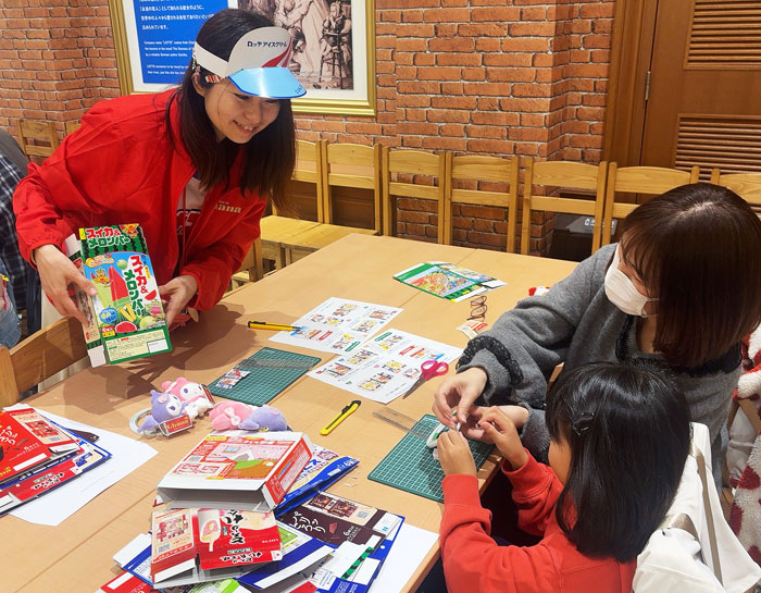 ロッテは2月28日、浦和工場内「おかしの学校」(さいたま市)で、アイスの空き箱を活用した親子向けワークショップを初開催した。子どもたちは保護者とともに社員の説明を聞きながら、パッケージに印字されたミニチュア用の図面を切り取ったり両面テープを貼ったりしてミニチュア作りに挑戦。真剣な表情で作業に取り組む姿が見られた。