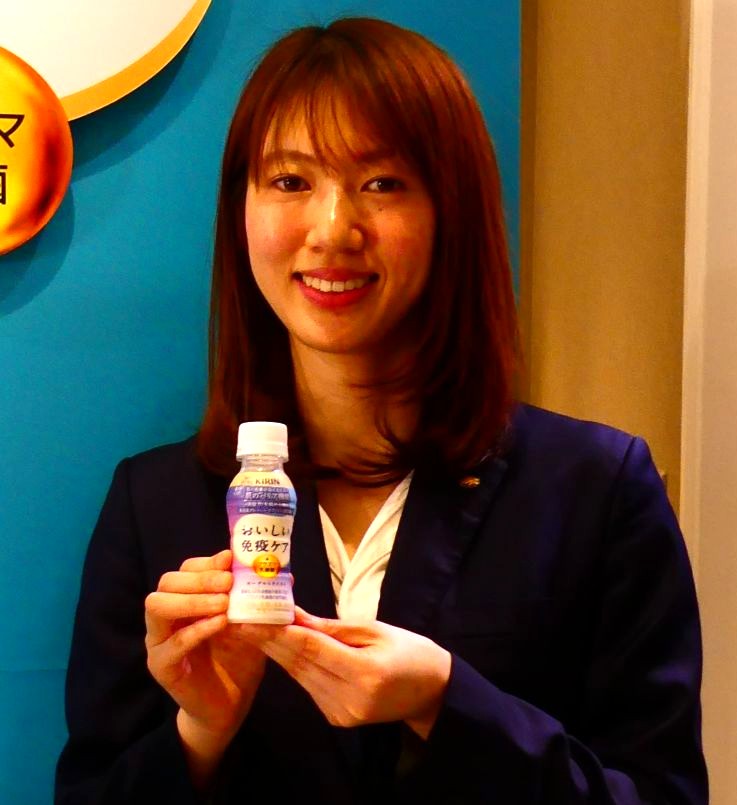 「おいしい免疫ケア セラミドプラス」を持つキリンビバレッジの阿戸瑛理子氏