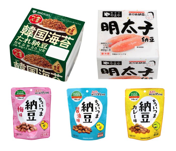 韓国海苔たれ納豆(ミツカン 左上)、明太子納豆(タカノフーズ 右上)、ちょいつま納豆(ヤマダフーズ)