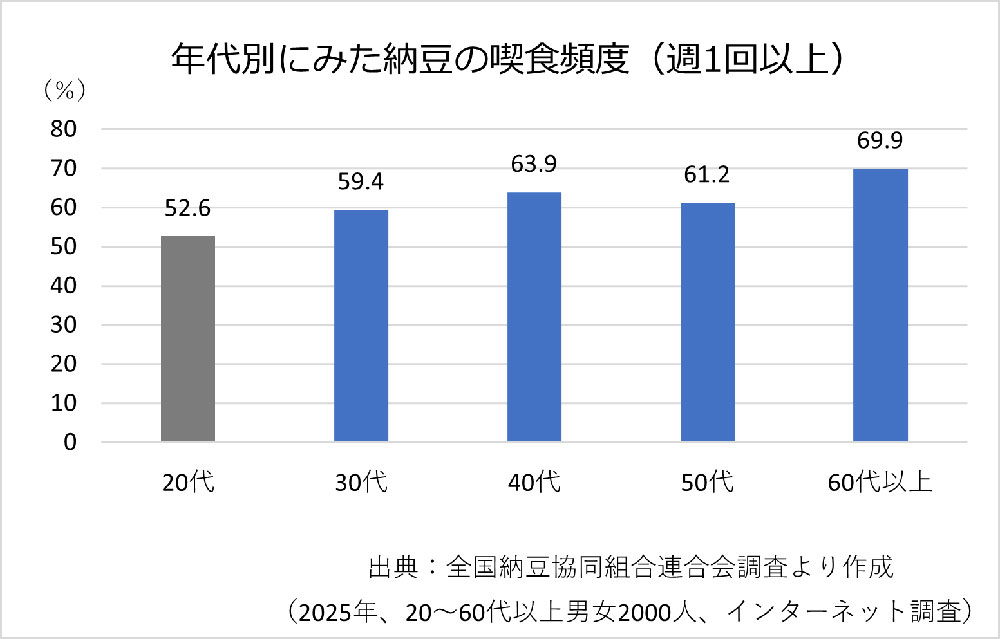 一方で、市場が安定している分、新規層の獲得は容易ではない。同調査でも、若年層では納豆の喫食頻度が他の年代に比べて低いことが示されている。また、食べ慣れによって好みが分かれやすく、若年層では食習慣としての定着が中高年層に比べて弱い側面もある。