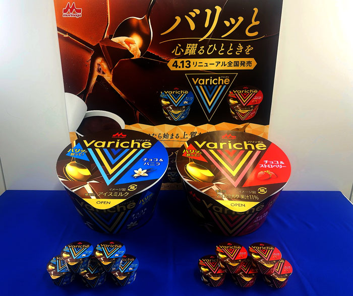 森永乳業は、圧倒的なチョコ量と食感の変化を特徴としたカップアイス「Variche(バリッチェ)チョコ&バニラ」「同 チョコ&ストロベリー」(110ml、税別300円)を4月13日に全国発売する。製品の約3分の1にチョコを配合した“圧倒的チョコ感”を打ち出し、すくうたびに食感が変化する体験価値を訴求。将来的に100億円規模への育成を目指す。