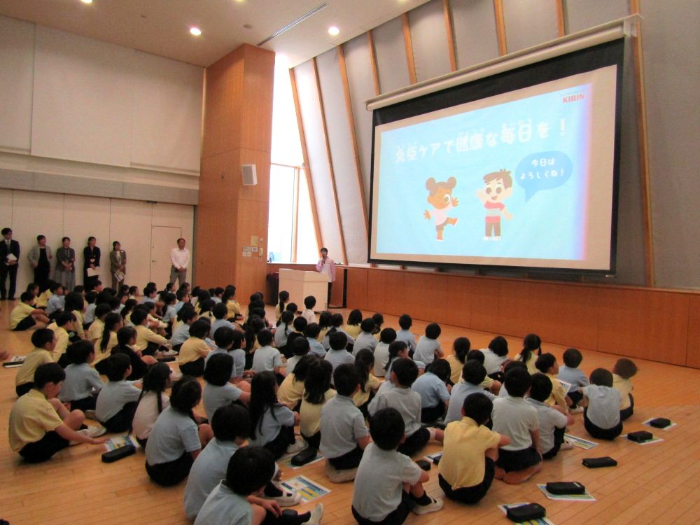 この日、同社は給食に先立ち、保護者58人にキリンの子どもの健康に関する取り組みを紹介したほか、児童を対象に免疫ケアの授業を実施した。