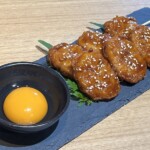 これは、串に「ナゲット」3ピースを刺し、市販のやきとりのたれを適量絡め、大葉を敷いた皿に盛り、その上にいりごまを適量振りかけて卵黄を添えたものとなる。