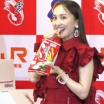 【写真】カルビー「かっぱえびせん」を口に入れる百田夏菜子さんと貸切列車発車の号令を行う百田夏菜子さん